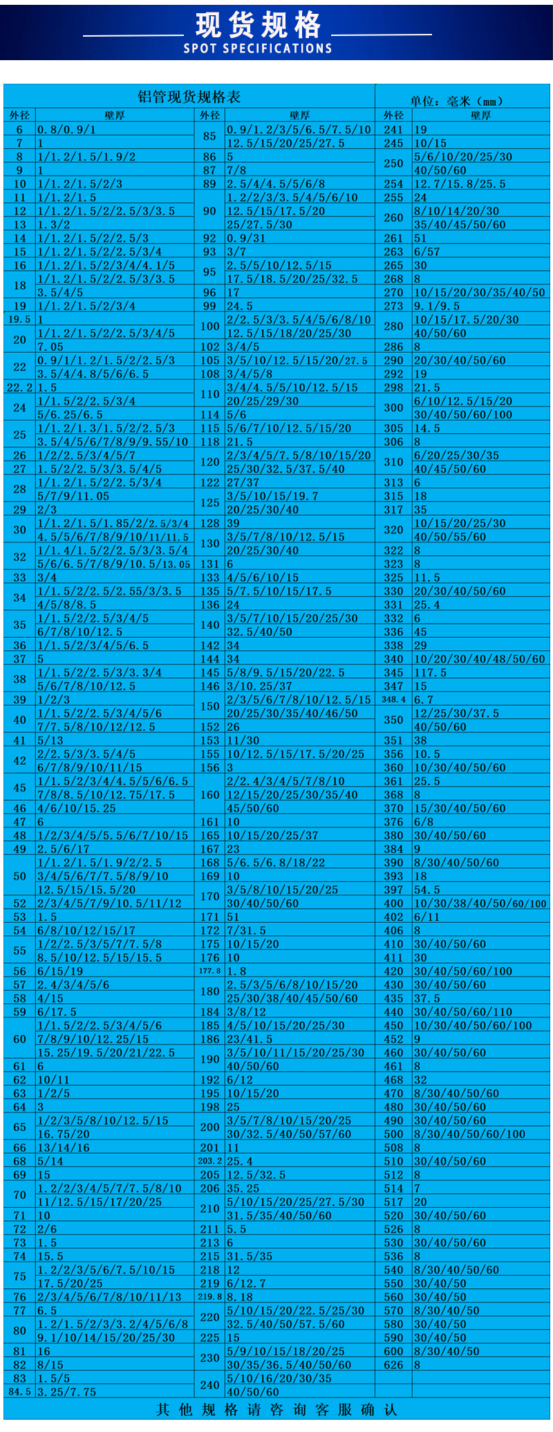 聚金鑫(上海)铝业有限公司主要经营无缝铝管,锻造铝管,挤压铝管,铝合金棒,铝方棒,铝排 5754铝管_5182铝管_锻造铝圆片_锻造铝管_6082铝管_7075铝棒 铝管  铝方管 无缝铝管 厚壁铝管 铝板 铝卷 铝棒 铝排 角铝 铝型材等有色金属,所售产品均执行铝材行业标准,有铝型材挤压生产线5条,喷涂、氧化生产线3条,配有CNC加工中心,以品质保障、现货规格多样、效率高来满足不同客户需求,所售铝型材主要应用于零部件制造业、工程、煤矿、电力、汽车工业、建筑装饰、能源化工、船舶制造业、机械工程、仪器设备、航空航天等行业。公司始终坚持为客户提供品质保障的铝材作为企业发展的根本,并为客户提供系统的铝材产品解决方案,以周到细致的服务回报广大客户.       主营产品材质有:6063(T6普遍的合金材质应用广泛) 6061(T4硬铝管) 2A12(LY12多为无缝铝管) 3A21(防锈硬铝) 6005(厚壁铝管) 7075(t5 T6航空铝管) 5052(5056 5083海洋用铝管) 1060(1050 1100纯铝管 多为铸铝管)     有缝铝管规格 直径4mm-506mm 壁厚0.7mm-50mm(材质基本为6063 6061 6005焊接性能好,硬度一般,应用多。     锻打铝管规格 直径8mm-260mm 壁厚1mm-25mm(材质全部为2024 也习惯称之为LY12 或者2A12 硬度高 制作工艺为硬铝棒穿孔)     防锈铝管规格 直径10mm-300mm 壁厚1mm-30mm(5系铝管 有缝,多数用于轮船,游轮,汽艇上)7075现货 直径16mm-185mm 壁厚2mm-16mm(7075材质多数为飞行器使用、其特点 密度低 质量轻,硬度高于普通合金1.5-2倍!但是其价格也比同等规格的铝管高了接近120%,所以价格决定了7075的铝管多数用在较为贵、精密的设备上面)
